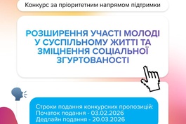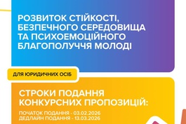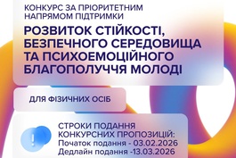 Український молодіжний фонд оголошує грантовий конкурс за пріоритетним напрямом «Розвиток стійкості, безпечного середовища та психоемоційного благополуччя молоді» для юридичних осіб! У час, коли молодь України живе й розвивається в умовах війни та відновлення, особливо важливо формувати умови, у яких молодь може почуватися захищеною, підтриманою та включеною. Саме тому ми запускаємо конкурс, спрямований на посилення стійкості та благополуччя молоді в усіх регіонах країни. Метою конкурсу є підтримка ініціатив, які допомагають молоді зберігати …