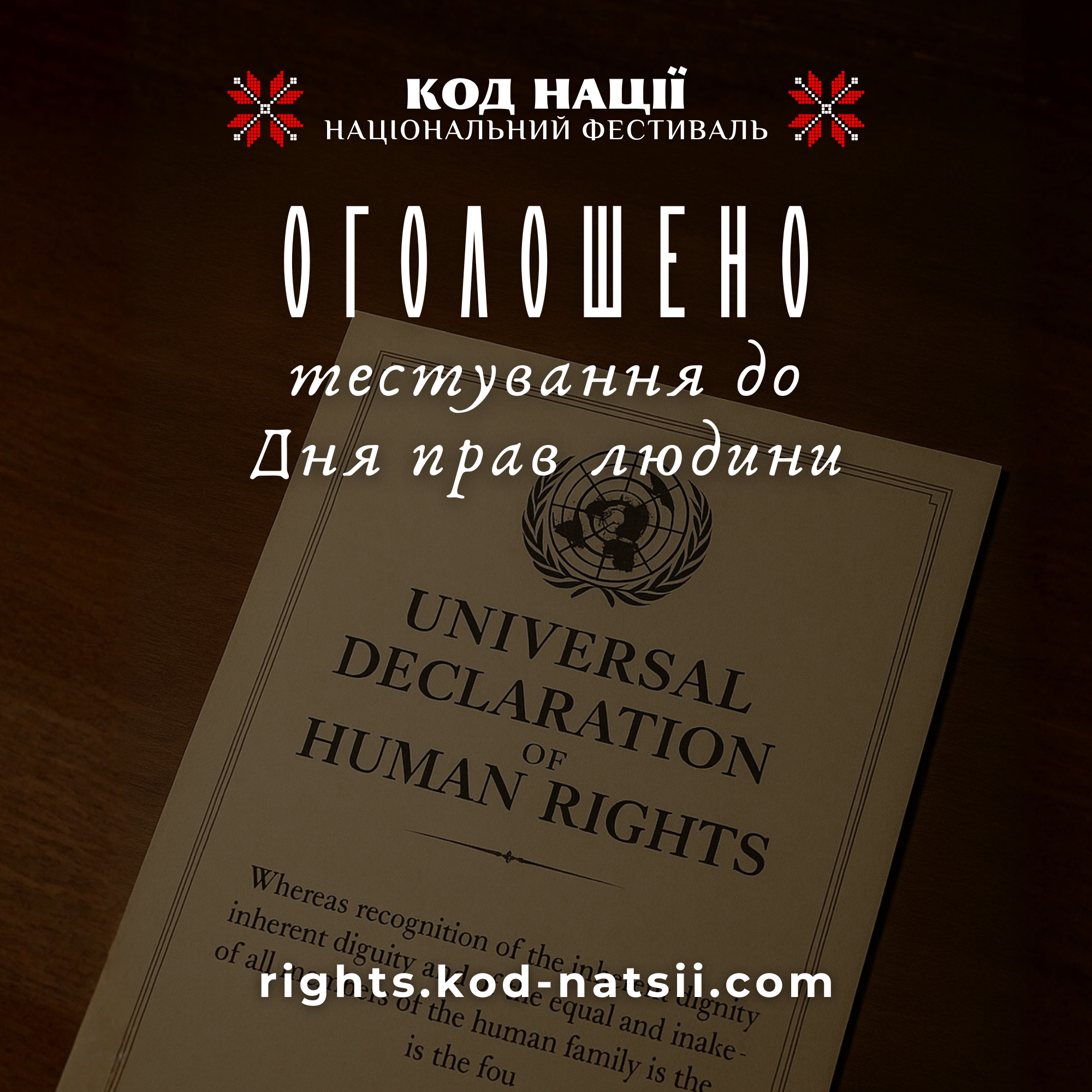 Освітня платформа Національного Фестивалю «Код Нації» оголошує проведення Тестування до Дня прав людини, який у всьому світі відзначається 10 грудня — на згадку про ухвалення Загальної декларації прав людини у 1948 році. Саме цей документ став фундаментом для захисту прав і свобод кожної людини.