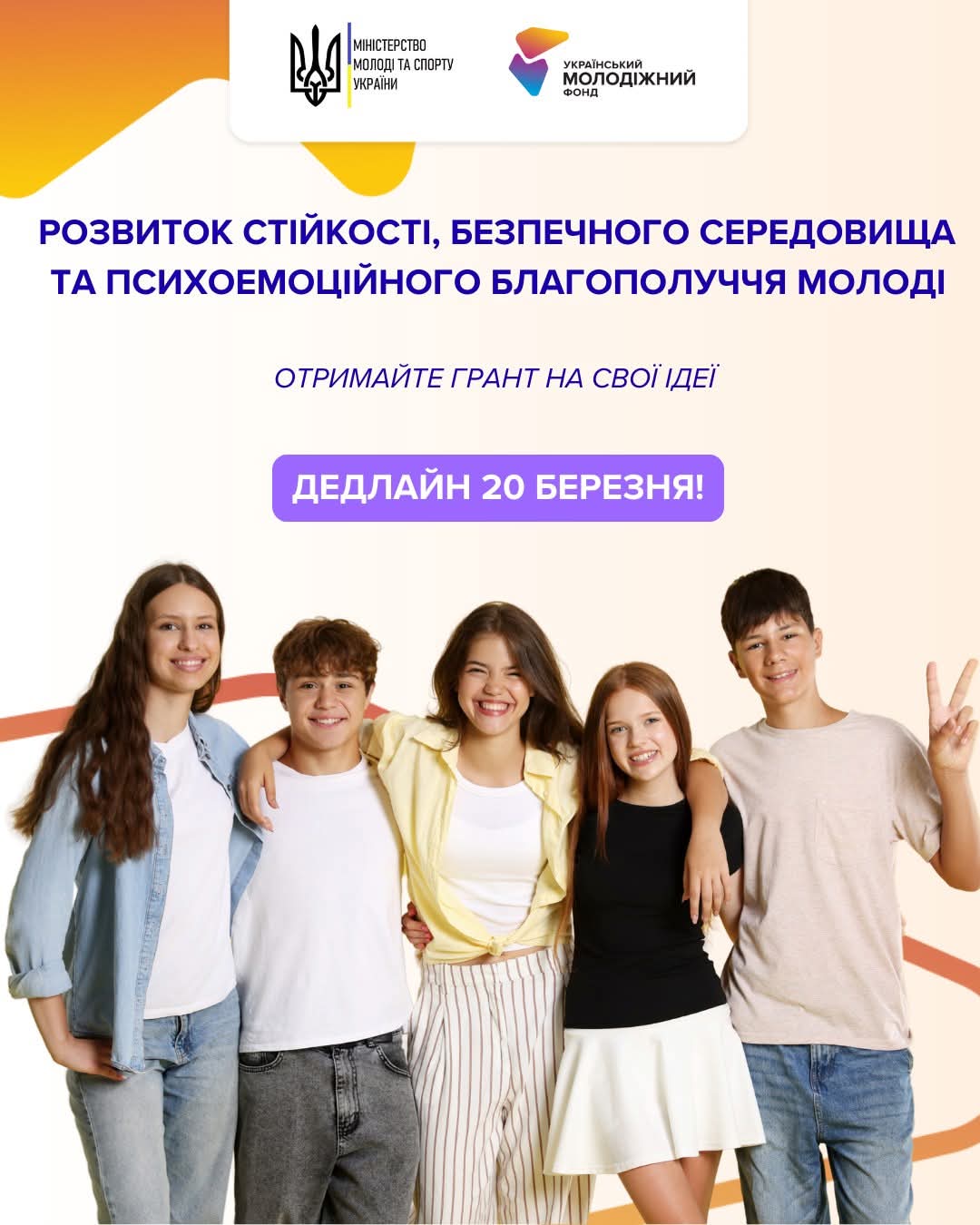 Конкурс за пріоритетним напрямом «Розвиток стійкості, безпечного середовища та психоемоційного благополуччя молоді» реалізується Міністерством молоді та спорту України і Українським молодіжним фондом.